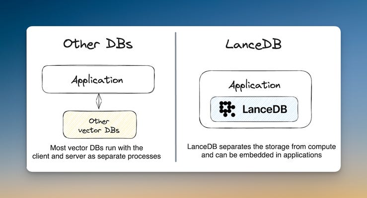 In contrast, LanceDB follows an embedded, serverless approach. The database is tightly coupled with the application code, which enables rapid development and prototyping. LanceDB is implemented in Rust from the ground up, which ensures speed, storage security and relatively low resource utilisation.