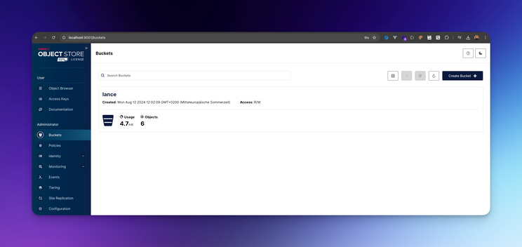 Therefore for central storage the vector database has to be saved in a file structure inside a bucket. You could use AWS S3 or Google Cloud Storage Bucket but if the entire IT landscape does not already uses one of the cloud hyperscalers, then I suggest to use the open source S3 alternative Min.io. It can be used as a drop-in replacement for existing apps that use AWS because it has full compatibility for the S3 API. Minio even has a full guide on how to start the the Minio containers with docker compose and setting up a bucket specifically for LanceDB.
